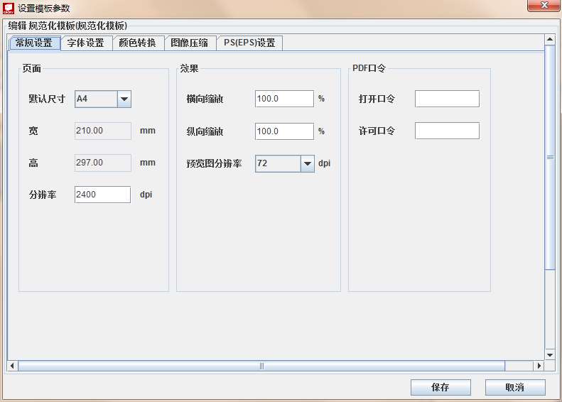 规范化模板是将源文件解释为标准的单个PDF文件。在模板中,分为四个参数设置标签页:常规设置、字体设置、图像压缩、PS(EPS)设置。其中的常规设置选项如图 4-11所示。