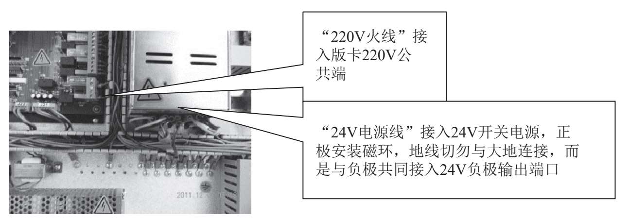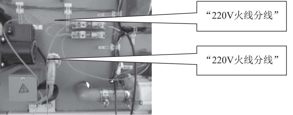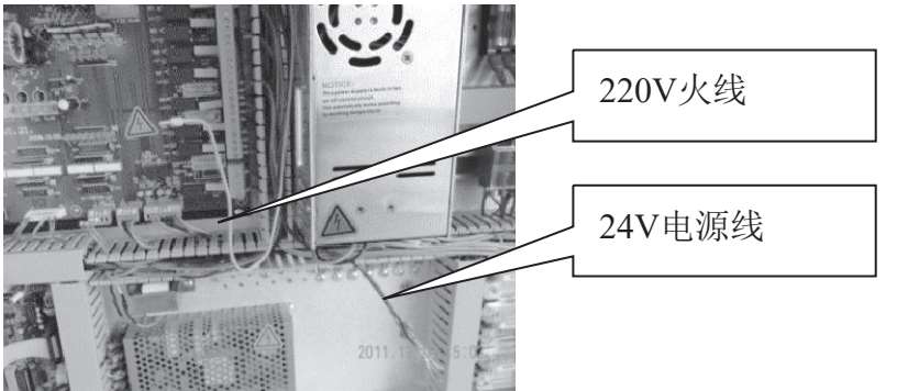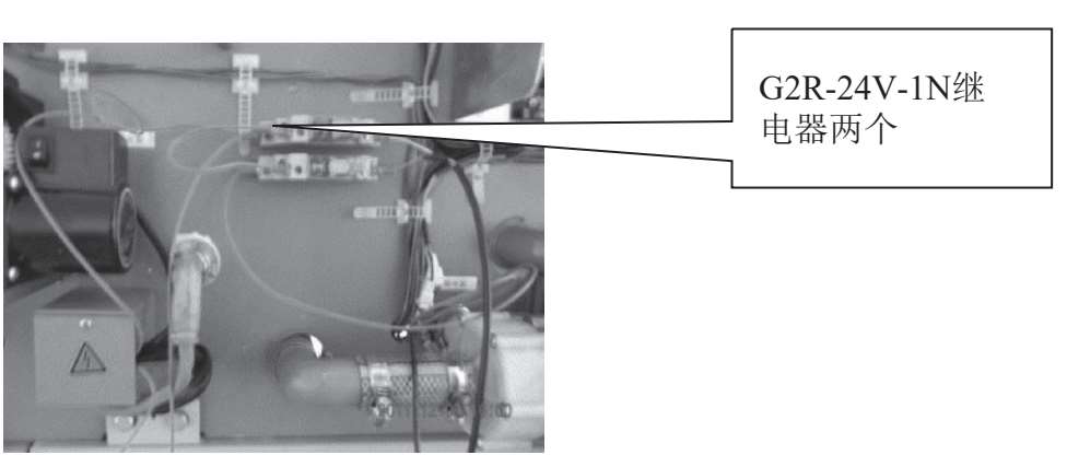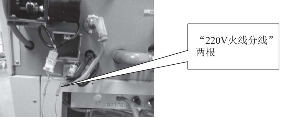 (3)再次关掉冲版机电源,从“电导率控制板套线”中找出用于连接“冲版机卡板上 220V火线”和“电导率控制板 24V电源线”的线,并从冲版机线槽中穿出,至电导率传感器和继电器的安装位置,与电导率控制板控制线连接(见图 5-3、图 5-4 和图 5-15);