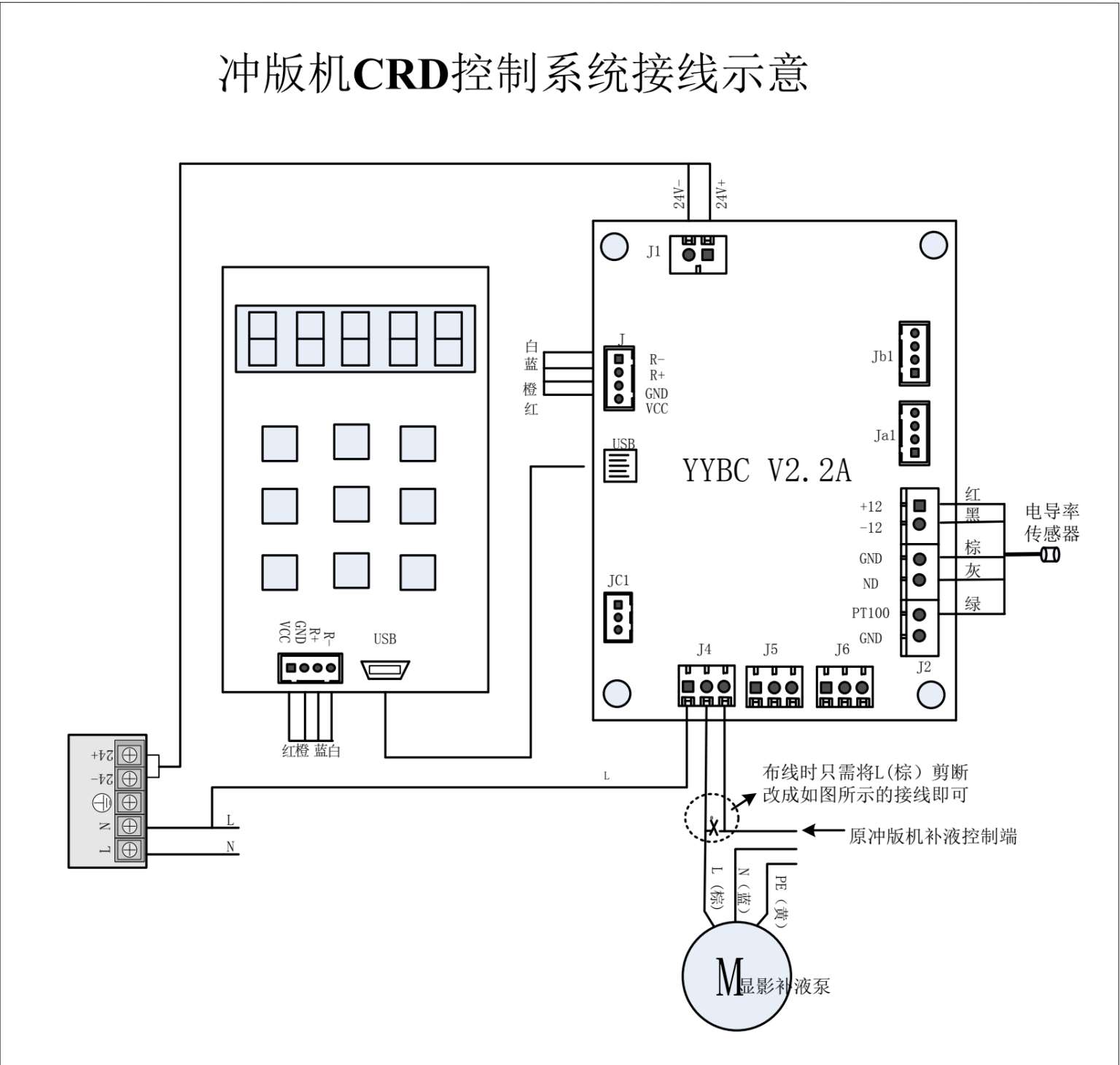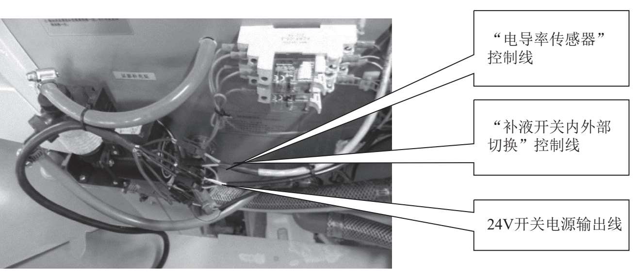 (5)冲版机自带补液开关上三芯接插件上的火线剪短,输入输出两端分别接出从“电导率控制板套线”中找出的两根“220V火线分线”(见图 5-6 和图 5-15);