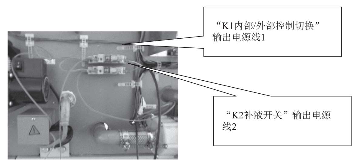 (8)工控继电器输出线的安装:从“电导率控制板套线”中找出的一根“K1 内部/外部控制切换”输出电源线 1 和“K2 补液开关”输出电源线 2 分别与两个继电器连接,另一端电导率控制板控制线连接(见图 5-9 和图 5-15);