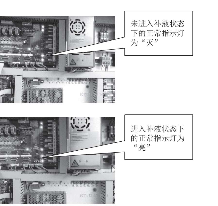 (2)打开冲版机电源,了解冲版机补液泵未进入补液状态下的正常指示灯情况,然后进入“手动操作”功能下进行强制补充,进而根据指示灯情况了解控制补液泵的继电器,以确定补液泵的正常情况和电源线路(见图 5-2);