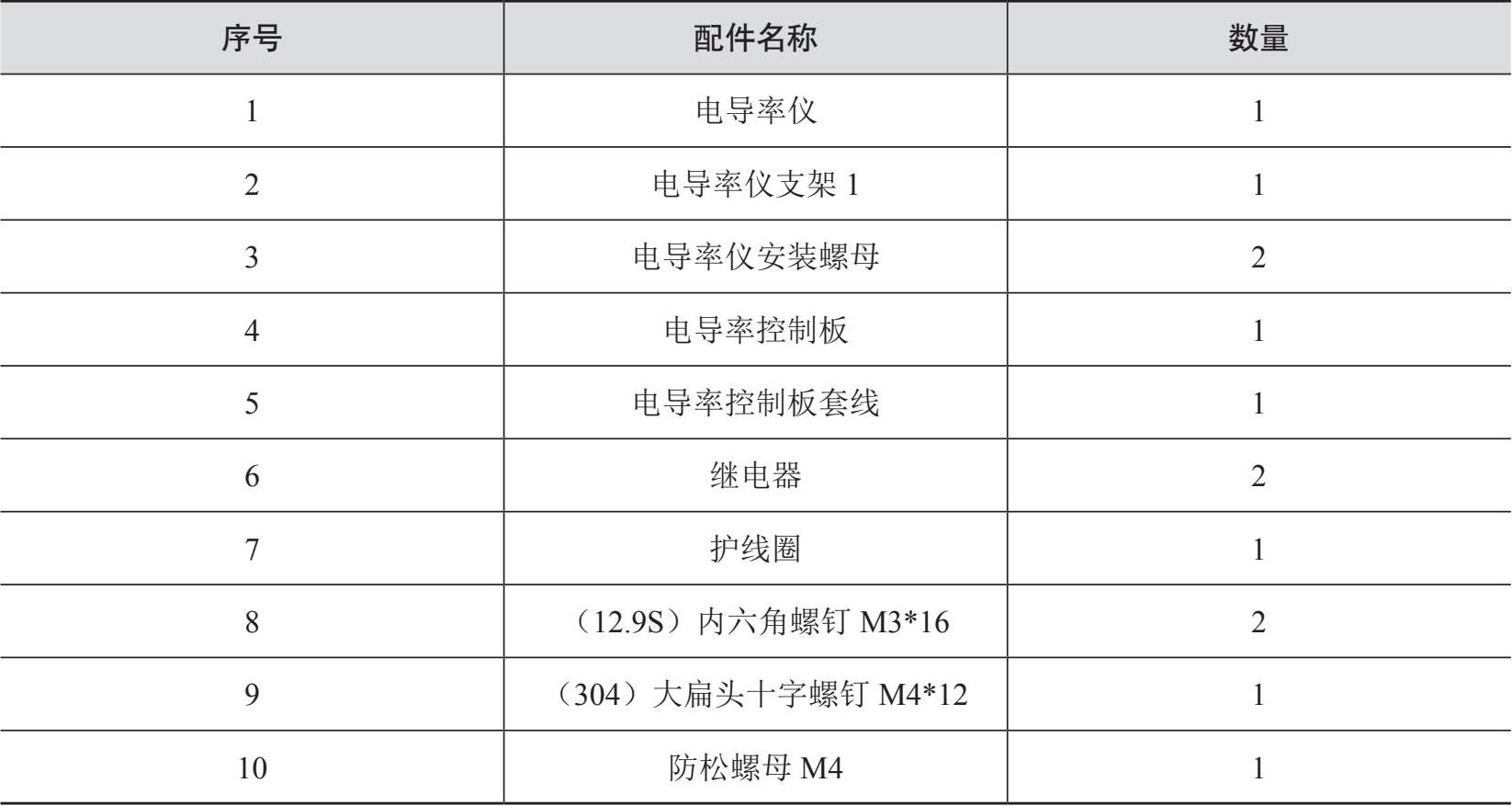 (11)电导率控制板的安装:采用工具“博世带扭矩电钻”“钻头Φ3.2”“丝锥M4”打出“电导率控制板”悬挂螺丝孔M4,采用零件“(304)大扁头十字螺钉M4 12”安装,内侧紧定“防松螺母M4”;采用工具“博世带扭矩电钻”“钻头Φ3.2”“钻头Φ13.5”打出“电导率控制板”连接线穿孔,同时采用“护线圈”安装孔内,以保护电导率控制线(见图 5-12);