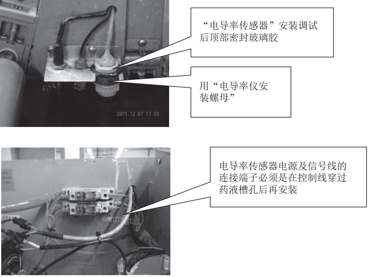 电导率(检10测)球电导须率置传于感液器面的以安下装,:需采注用意:“电传导感率器仪感安应装孔螺 架更 母换1向” ”必将“须 导率垂 直传于感药器槽安侧装板于方支向架,上即,与胶辊方向平行,否则易造成由于药液频繁流动而使传感器监测不稳定的现象(见图 5-11);