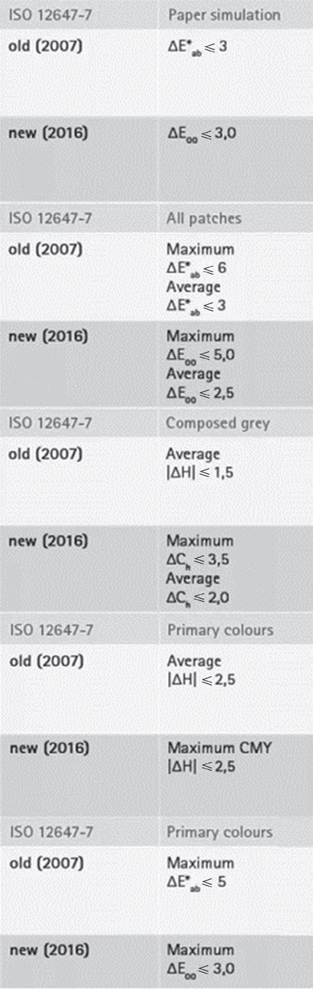 控制色块色差是一个重要的变化。色差公式采用与视觉评估更加一致的△ E 2000 而不再是△ E 76 ,由于△ E 2000 (*00)和△ E 76 (*ab)这两个公式不能互相转换,因此新版标准定义了新的容差要求。