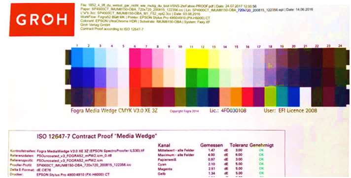 数码打样系统虽然比较稳定,但仍然会有颜色偏移。ISO 12647-7 标准规定,CMYK实地及 50%的网点,以及RGB需要被二次评估,最大色差△ E 00 不超过 2.0,应该选用同一个仪器,测量同一个位置,必要时需要重新校准打样系统。