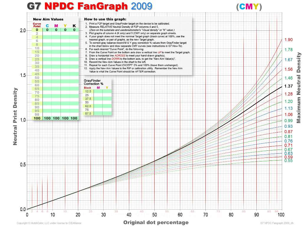 在NPDC扇形图中,确定最接近实际印刷实地密度值的标准曲线。然后,找到需要校正的点。对每一个校正点进行校正。从下至上画一条竖线,交于目标线在交点处,画一条横线,与C、M和Y线相交在交点处,从上至下画若干条竖线,与坐标横轴相交,得到C、M、Y的三个新的目标值。在图纸的新值栏上记录CMY的目标值重复每一个曲线点,0%和 100%不变。