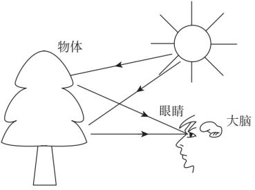 颜色视觉产生的过程是:光源(包括太阳光与各种人工光源)发出的光照在物体表面,经过物体对光选择性地吸收反射或透射之后作用于人眼,由人眼内视细胞将光刺激转换为神经冲动由视神经传入大脑,由大脑判断出该物体的颜色。由此可知,光源、物体、眼睛、大脑是颜色视觉(以下简称色觉)产生的四大要素,如图2-1所示。