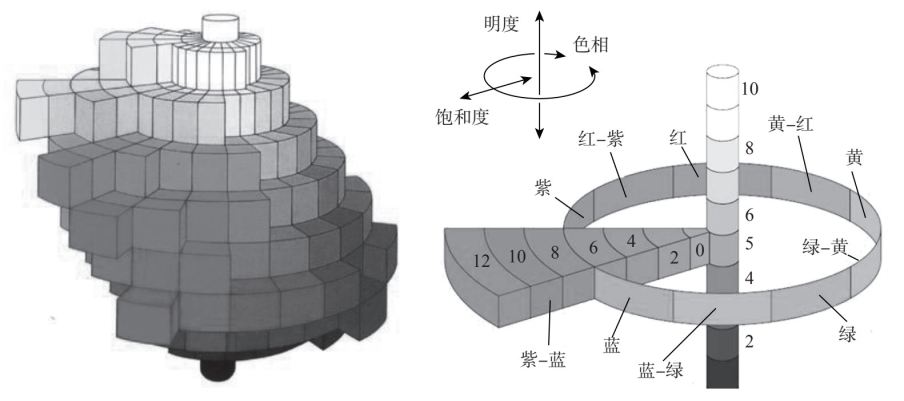 人们对颜色的表示方法基本上分为两大类,即显色表色标准和混色表色标准。显色表色标准最著名的代表就是孟塞尔表色系统。在该系统中,颜色的三种基本属性定义为:色相或色调、明度和彩度(饱和度),如图2-3所示。