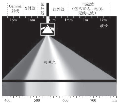 在色觉形成的过程中,光源显然为四要素之首。光是电磁波辐射的一部分,因而光源又称作物理辐射体。并不是所有的电磁波都能引起人眼的视觉反应,刺激人眼能引起视觉感觉的电磁波辐射称为可见光辐射,简称可见光或光。可见光的波长范围在380~780nm(1nm=10 -6 mm=10 -9 m),在整个电磁波谱中只占很小的一部分,如图2-2所示。