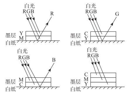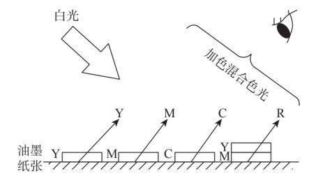 印刷品的呈色即是利用减色原理,印刷机在纸上或其他承印物上印上青、品红和黄等三种原色色墨,则必须使用反射光来作业,从白纸上反射出红、绿和蓝色光量。彩色印刷是利用大小不同的网目调网点以不同的角度一层层叠印在纸上而产生复杂的色彩。纸张本身对色彩复制有极重要的影响。