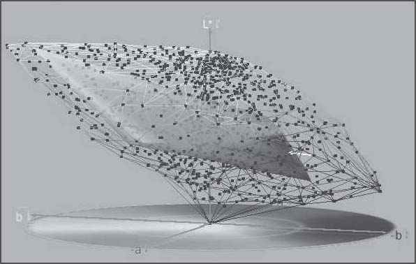 专色打样与四色印刷打样的原理和机制不同,其目标不是色域匹配或者色彩数据的整体转换,而是个别特定色彩的模拟和再现。由于专色的数量和种类繁多,准确模拟和输出专色是数字化打样系统的关键问题之一。图2-34是部分专色与打印机色域的空间位置比较,其中蓝色格点代表专色,中间实体代表打印机空间色域,很容易发现很多专色位于打印机空间色域之外,打印机很难模拟。