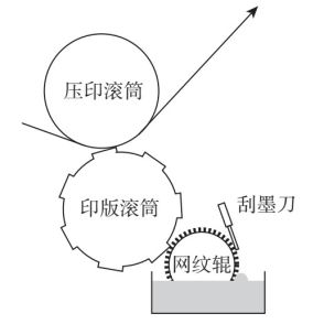柔性版印刷是指使用柔性印版,采用网纹传墨辊传递适量油墨到印版表面,印版滚筒和压印滚筒进行压印,从而使油墨转移到承印材料上,以此完成印刷的技术方法,其工作原理如图3-1所示。柔性版印刷兼有凸印、胶印和凹印三者的特性。从印版结构来看,其图文部分凸起,高于非图文部分,具有凸印的特性;从印刷适性来说,它是柔性的印版版面与印刷承印材料接触,具有胶印特性;从输墨机构来说,其结构简单,属于短墨路输墨方式,具有凹印的特点。