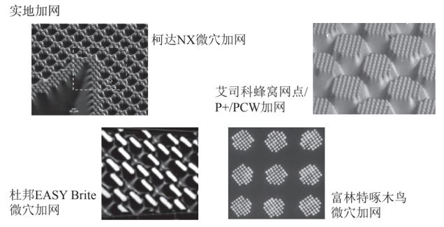 相比凹印,柔印的色密度比较低。在柔印行业,特别是奶包、标签、预印、透气膜等应用领域,在制版时会进行实地加网和中间调网上加网,主要是为了提升实地和文字色块的色密度、优化外观品质、减少白针孔、提高文字和细小内容清晰度、提升颜色饱和度等。其原理就是通过把网点面积率100%的实地地方改为有网点,制出来的印版在实地的地方就出现了很多小坑(就是印版的表面变粗糙了),这样油墨在印版上相对光面来说就有了更大的表面积,从而从网纹辊转移到印版上的油墨变多了,由印版转移到承印材料上的油墨也变多了,由此可以提升实地色密度和减少白针孔现象。ESKO的“Pixel+”技术,杜邦的Easy Brite网点技术,赛康的啄木鸟微穴加网技术都是微穴加网技术的代表,如图3-8所示。