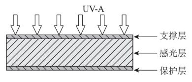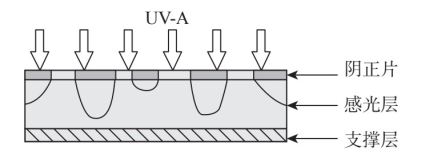 曝光是在晒版机中,将正向阴图底片和柔性版材紧密接触,先进行背面曝光,再进行正面曝光,如图3-3和图3-4所示。