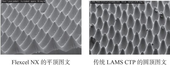 LAMS CTP系统自使用以来已经有了不少的改进,比如,柯达公司的Flexcel NX 系统通过对材料的改进,使得凸起的图文部分顶部成为更精细的“平顶”,相对于一般的LAMS CTP,这个改进有力地提高了产品阶调复制再现性能,如图3-6所示。