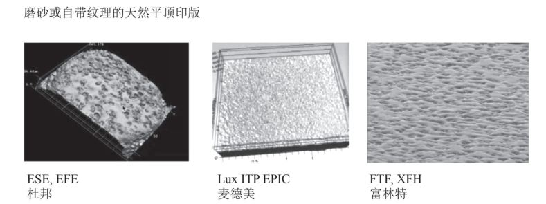 随后出现的磨砂表面版材,即便不使用微穴加网技术,也可以获得比较好的实地密度。杜邦的磨砂表面版材是基于自带平顶网点技术,在印版表面再增加一层特别的树脂层用来提升油墨转移的版材,杜邦的磨砂表面版材也被称为多层版。和杜邦的磨砂表面版材相似的还有富林特的表面纹理印版,如图3-9所示。这些版材都能增加油墨的转移,提高色块的色密度。