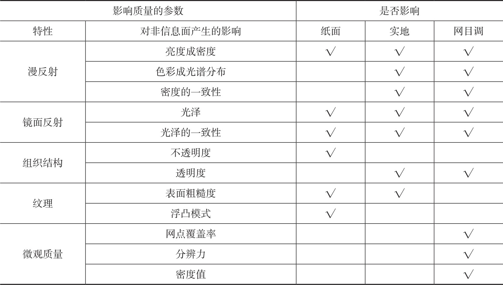 影响非信息面质量高低的因素主要包括漫反射性质、在整个非信息面上漫反射的一致性、光谱分布或色彩。镜面反射和光泽也是很重要的,但透明度和不透明度只影响纸张本身,纹理主要与表面的平整性和几何凹凸有关。影响非信息面质量高低的因素如表3-7所示。对于这些性质主要从反射密度和光泽两个方面考虑,主要考虑它们的平均值、在整个非信息面分布的偏差和纹理的影响。