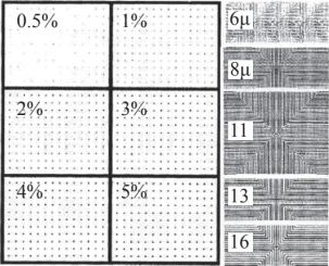 从这一边区网点增大理论可以得知两个规律:一是5%~95%的网点大小不同,其边缘长度也不一样,所以网点增大不同。用玛雷-戴维思(Murray-Davies)公式计算网点增大,可以看出,50%网点边缘最长,所以增大最多。二是细网线网点的外边长度大于粗网线网点的外边长度,所以细网线比粗网线的网点增大多。例如,175线/英寸比150线/英寸的网点增大多,200线/英寸比175线/英寸的网点增大多。