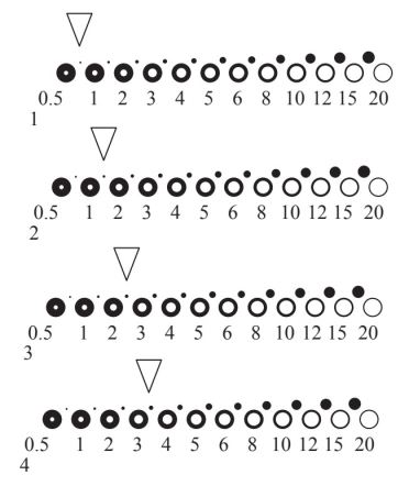 ②靠近十字线横线第一排有13个网点,靠里边的一排网点是由大到小的小黑点,旁边与之对应的是12个由大到小的空心白点,其分别为0.5%、1%、2%、3%、4%、5%、6%、8%、10%、12%、20%,阳点与阴点对应排列,如图3-26所示。