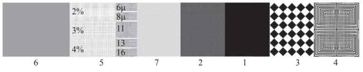 图中1所示为实地色块段,图中2所示为75%细网段,图中3所示为50%粗网(10线/厘米)段,图中4所示为50%细网微测段,图中5所示为细线与小网点控制段,图中6所示为灰平衡观察段,图中7所示为25%细网段。