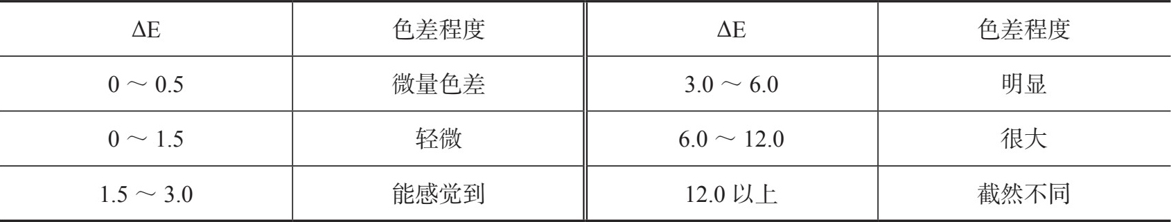 光谱式色差计也称分光色差计,是把可见的白光分为非常窄细的间隔,而每一个间隔即代表白光里不同波长的部分。由于白光光谱能被分成细小部分,故分光色差计能收集更多信息,使其精确度比密度计高,有更佳的重复性与吻合性。光谱式色差计也可以把测量结果以数字形式显示在屏幕上,用于测量细微的颜色差别。色差的数值ΔE与色差程度的关系如表3-8所示。