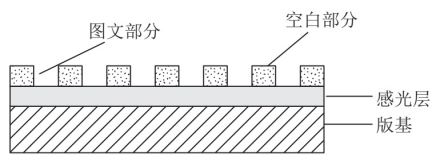 无水胶印印版是一种平凹版,图文部分低于印版的表面,如图3-29所示。它也有阳图型和阴图型之分,目前使用较多的是阳图型无水胶印版。阳图型无水胶印版曝光后,印版上见光部分(空白部分)的硅胶层发生架桥反应,进行光交联;而未见光部分(图文部分)的硅胶层则在显影液的作用下被除去,露出下面的感光树脂层。感光树脂层是亲墨的,而非图文部分的硅胶层斥墨,这样不再需要润版液的介入,就可以完成油墨的选择性吸附。