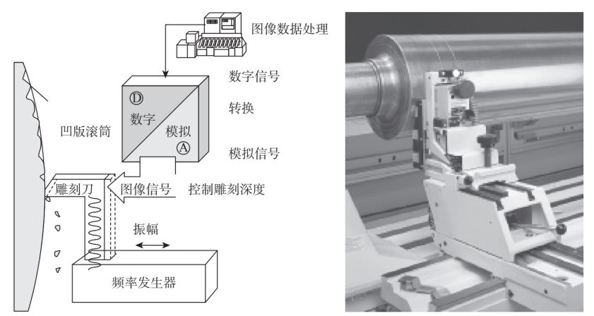 电子雕刻机由原稿滚筒(或叫扫描滚筒)、印版滚筒、扫描头、雕刻头、传动系统、电子控制系统等组成。电子雕刻机的工作原理是:扫描头对原稿进行扫描,从原稿上反射回来的强弱不同的光信号,经过光电转换器使光信号转换成电信号,再通过放大器和数据处理,使光的强弱转换为电流的大小,控制雕刻头在铜滚筒上进行雕刻。电子雕刻机的工作方式,如图3-35所示。原稿滚筒和雕刻滚筒同步运转,同时雕刻系统沿着滚筒轴向移动,金刚石刻针在凹印版滚筒上雕刻出每一个网穴,由于刻刀的雕刻频率是恒定的(3600~4200网穴/秒),所以滚筒的旋转速度决定了每英寸的网点数。由分色工艺提供的数字信息能使刻刀连续有规则地振动,网穴的大小及深度由原稿的密度来决定,被扫描原稿的密度和被刻出的网穴深度之间的数量关系,可以在计算机上调整。电子雕刻比化学蚀刻能够获得更加坚固的网墙。电子雕刻能进行圆周方向无缝雕刻,自动选择层次,调整网线角度等。