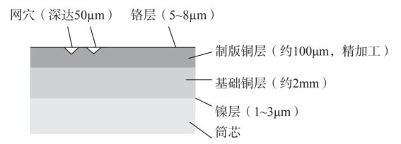(5)镀铬层。由于铜的硬度一般在90~180HV。印刷时刮墨刀很容易将印版刮伤。由于金属铬的硬度很高,在800~1000HV,耐磨性很好,所以当凹版滚筒图文制作完成后,再在铜表面镀一层铬,使滚筒表面更加坚固耐磨,且金属铬具有较低的摩擦系数,有助于刮墨刀的滑动,提高凹版的耐印力。凹印版滚筒的使用寿命可达到百万印以上。