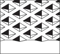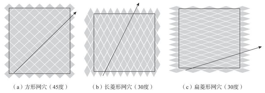 电子雕刻机可以直接使用分色加网的底片进行制版,故扫描底片可以在印前的桌面出版系统中制作获取,然后使用吊车将印版安装在电子雕刻机上,雕刻前清除版面的油污、灰尘、氧化物。把扫描底片平服地粘贴在原稿滚筒上。根据原稿(扫描片)的要求和油墨的色相,结合印刷产品制定试刻值。例如,装饰印刷的纸张比较粗糙,吸墨性强,雕刻深度须在45~50μm才能达印刷要求,必须调整雕刻放大器上的电流、电压。最后扫描头对原稿进行扫描,雕刻头与扫描头同步运转,印版滚筒表面被雕刻成深浅不同的网穴。新型的电子雕刻机有三种形状的网点角度,可以在操作时任意选择,如图3-36所示。