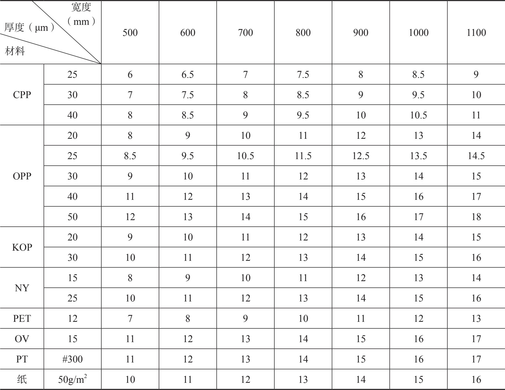 印刷张力是印刷工艺的重要工艺参数,根据不同的承印基材的规格进行设定,如厚度;材料易延伸,难以套准;张力太小,材料松弛,会不规则走动,亦无法套色准确。通常设定的张力值以能够套准、收卷整齐时的最小张力为佳。常见的印刷基材张力设定值见表3-11,以进料张力为基准。