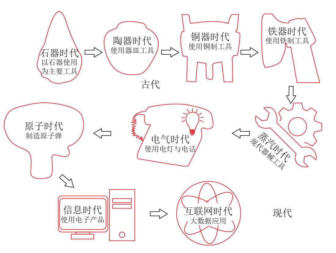 另外,从日常盛水用的陶器到现代容器、从祭祀的青铜器到现代的各处酒器碗具,也都有漫长的进化与改进过程,以更适合人们的使用习惯。从石器开始发展的各种工具时代,在经历多次工业革命走到了当今互联网时代,我们进入了主动依赖电子产品进行交互操作,以实现实时信息交流的数据时代,如图2-6所示。