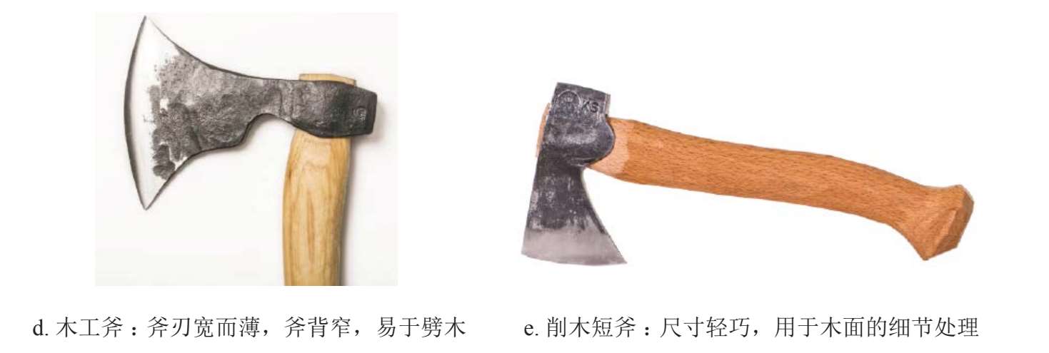 产品的交互设计需要符合人的行为习惯。交互设计的概念始于远古时期的工具制作过程,并随着科技的进步在产品中的痕迹越发明显起来。当科技水平普遍处于原始状态的时候,交互设计一直处于摸索状态。随着社会的进步,设计师会根据使用情境中人对工具的把控能力制作产品。比如,一把斧子从出现到现代,经历了多个时期的不同形态。最早是石器时代的手斧(图2-5a),宽的一头是手握之处。后来为了使用方便并减少对手的损伤,添加了木制的手柄(图2-5b)。带柄的斧头发展至今,根据不同的用途分成了不同的类型:伐木斧、木工斧、削木短斧等,其重量,斧刃斧背的长度、宽度、厚度,手柄与斧刃间的角度,手柄木的软硬与长度等都会有所不同(图2-5c~图2-5e)。甚至不同国家的工具传统、气候和木质不同,斧子设计时也会有不同的考虑。这些针对斧子的精细设计,属于典型的交互设计产品。