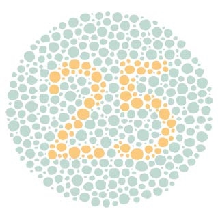 在产品中最需要获得色彩关心的用户,是色盲疾病患者。色盲并不是失明,而是色觉的缺陷,是在正常光线下对色彩的感知能力下降或者无法清晰分辨颜色,男性比女性更容易有色彩辨识下降的问题。通常的色盲表现为红/绿色无法分辨的色盲,即正常人红、绿、蓝三种感受器中的红色绿色感受器功能不健全。因此会混淆红色和绿色,所以在设计的过程中,尽量避免此类配色方式。如图2-2中的图案,常被用于色盲症的检测。