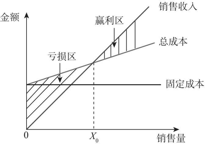 盈亏平衡分析法也称量本利分析法、保本分析法,是研究产量、成本、利润三者关系的一种简便方法。该法的基本原理是将总成本分为固定成本与变动成本,前者不随产量增减而变化,后者与产量成比例变化。当取得的销售收入与产生的总成本相等时,利润为零,即实现盈亏平衡。如图 2-1 所示,总成本线与销售收入线的交点 0 称为收支平衡点,对应的销量 X 0 为盈亏平衡点,销量大于 X 0 将赢利,小于 X 0 则会亏损。盈亏平衡点计算公式: X 0 =固定成本/(单位产品售价-单位产品变动成本)。运用盈亏平衡分析法可以进行定价决策、经营方案的比较、企业经营状况的评价。
