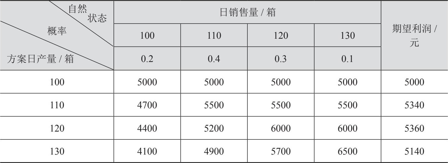 ② 最大可能获得收益的方案。因为日销产量 110 箱出现的机会最大为 0.4,决策人很可能选取日产 110 箱的方案。此时,最大可能获得的收益为 5500 元。