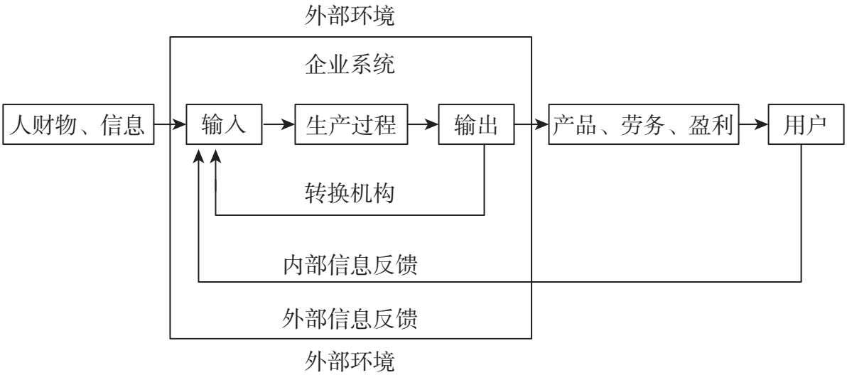 现代企业管理的根本任务是在社会主义市场经济的条件下,通过有效管理,合理组织企业系统的人、财、物和信息等生产要素,创造一种良好的工作环境,以最少的投入,通过企业的工作系统,取得更大的产出。企业的任务主要是在生产经营活动过程中实现的,而企业系统是社会大系统的一个开放性的子系统,它受环境即大系统的制约,又由许多小系统所组成。它通过相互联系和共同工作把人财物、产供销及信息等要素组成企业系统,它同周围环境之间存着动态的相互作用,并且具有内部的和外部的信息反馈网络。分析企业生产经营活动的投入、转换、产出关系可以展示企业是如何实现管理任务、提高经济效益的。构成企业生产经营活动的投入、转换和产出三部分是一个动态系统,如图 1-1 所示。