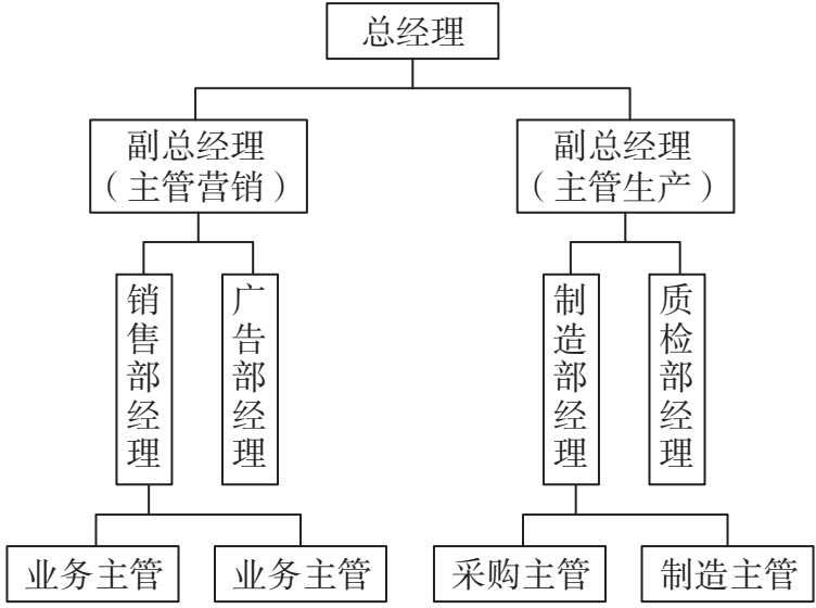 直线型组织是一种比较简单的组织结构形式,但又是最基本的结构形式,它的特点是:组织中各种职务按垂直系统直线排列,不存在管理的职能分工,管理者扮演全能式人物。这种类型的组织所具有的最大优点是:结构比较简单,权力集中,责任分明,命令统一,联系简捷,决策迅速。缺点是:在组织规模较大的情况下,所有的管理职能都集中由一个人承担,往往由于个人的知识及能力有限而感到难于应付,顾此失彼,可能会发生较多失误;同时,由于权力最终高度集中于最高负责人,容易造成掌权者滥用权力的问题,特别是在掌权者个人素质不高和掌权者突然发生变动的情况下,可能会给组织带来严重损失;此外,每个部门基本关心的是本部门的工作,因而部门间的协调比较差。直线型组织只适用于那些没有必要按职能实行专业化管理的小型包装企业,或者是包装企业现场的作业管理。如图 1-3 所示。
