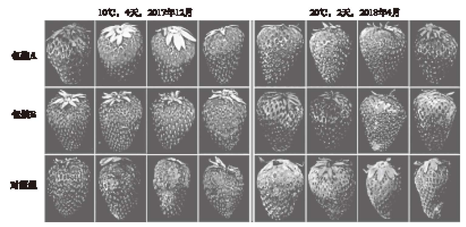从表3-3和图3-14可以看出,三组包装之间草莓的外观存在显著差异。包装A在保持草莓总体外观方面最有效,对照组草莓的外观质量很差。感官得分高低和草莓外观照片的质量基本一致。对照组草莓的质地值和亮度值得分较低。在10℃下贮藏4天后,对照组草莓色泽暗淡,呈暗红色,有轻微腐烂。而包装组草莓,特别是包装A组草莓的颜色和光泽度仍保持得非常鲜艳。在20℃下贮藏2天的结果也基本一致。