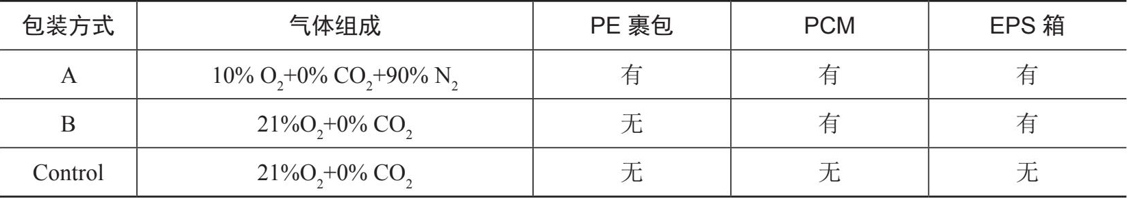 聚乙烯薄膜(PE)的密度为0.910~0.925g cm -3 ,O 2 渗透率为24.5±0.15cm 3 m −2 ·24h -1 ,CO 2 渗透率为110±1.67CO 2 cm 3 m -2 ·24h -1 ,水蒸气渗透率为2.21±0.31g m −2 ·24h -1 。EPS包装箱尺寸为370mm×250mm×205mm,EPS密度为0.020~0.025g cm -3 ,热导率为0.037~0.041W mK -1 。