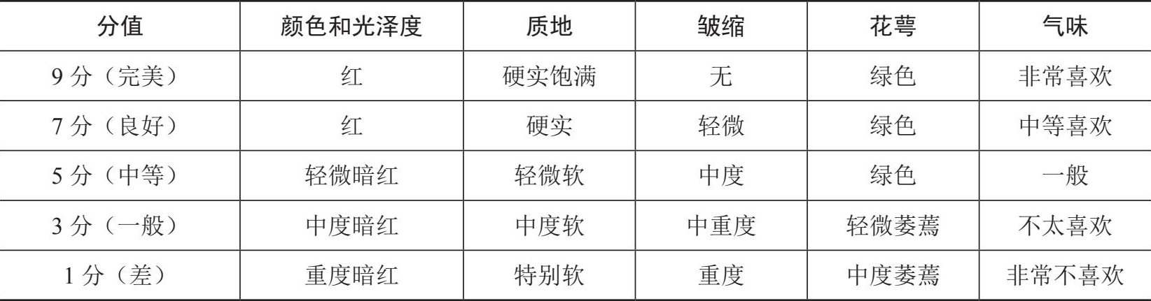 本试验所有测试项目参照文献 [29] 的描述,包括失重率测试,单位为%;硬度测试,单位为N;可溶性固形物含量(TSS)测试,单位为oBrix;外观颜色测试(a为红度值,L为亮度值);呼吸速率测试,单位为mg kg -1 h -1 ;相对电导率测试,单位为%;感官评定,具体的评价标准见表3-2。