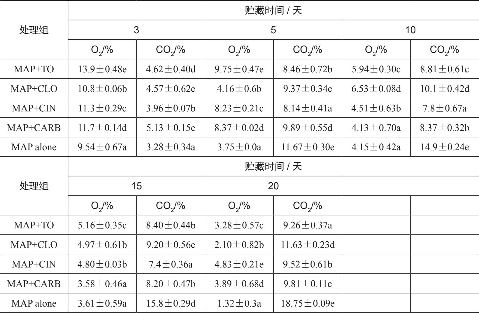 表4-2 贮藏期间各处理组杧果(cv.Totapuri)包装内的气体成分 [4]