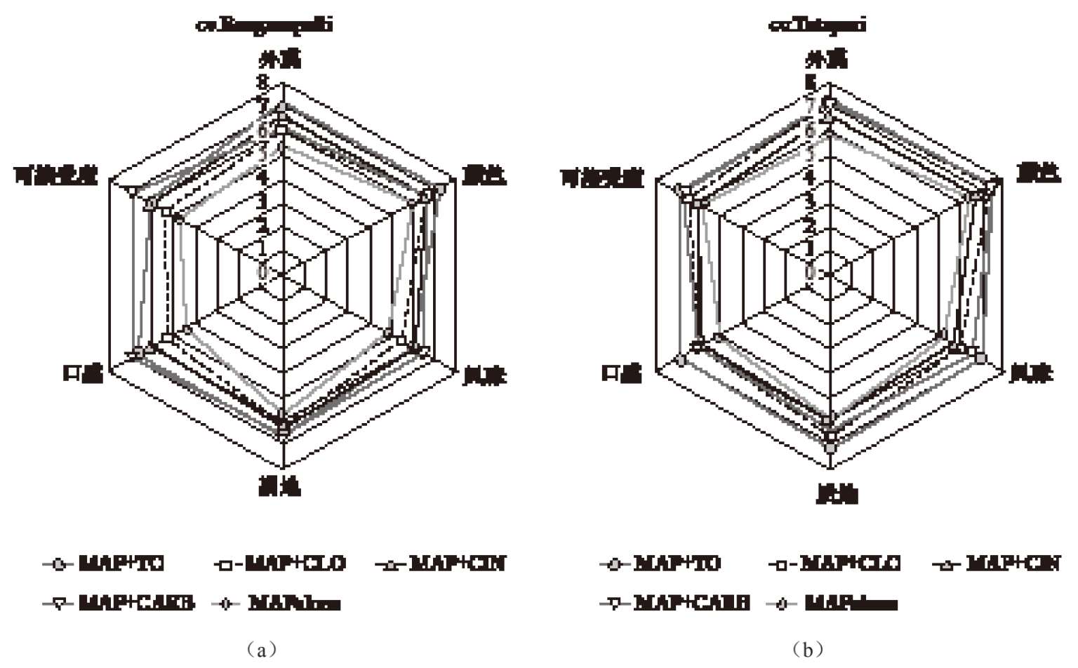 从图4-6可以看出,贮藏期结束时,对两种杧果在颜色、口感、风味、质地、外观和总体可接受度方面进行评定,感官分析显示,各处理组杧果(cv.Banganapalli和cv.Totapuri)的总体可接受度得分没有很大的差异。在颜色方面,处理组杧果的评分分值变化很小,这表明MAP+EOs没有改变或破坏杧果的颜色。在风味方面,MAP alone组和MAP+EOs组得分差异不大,MAP+EOs组杧果的风味评分均高于5分。尽管评定小组成员的结论显示,MAP+TO组和MAP+CARB组杧果的口感得分相当,但MAP+TO组杧果的表面颜色和总体可接受度更好。而且,打开包装后,MAP+TO组杧果也没有不愉快的味道。