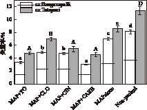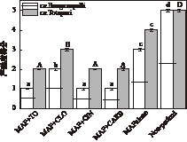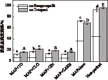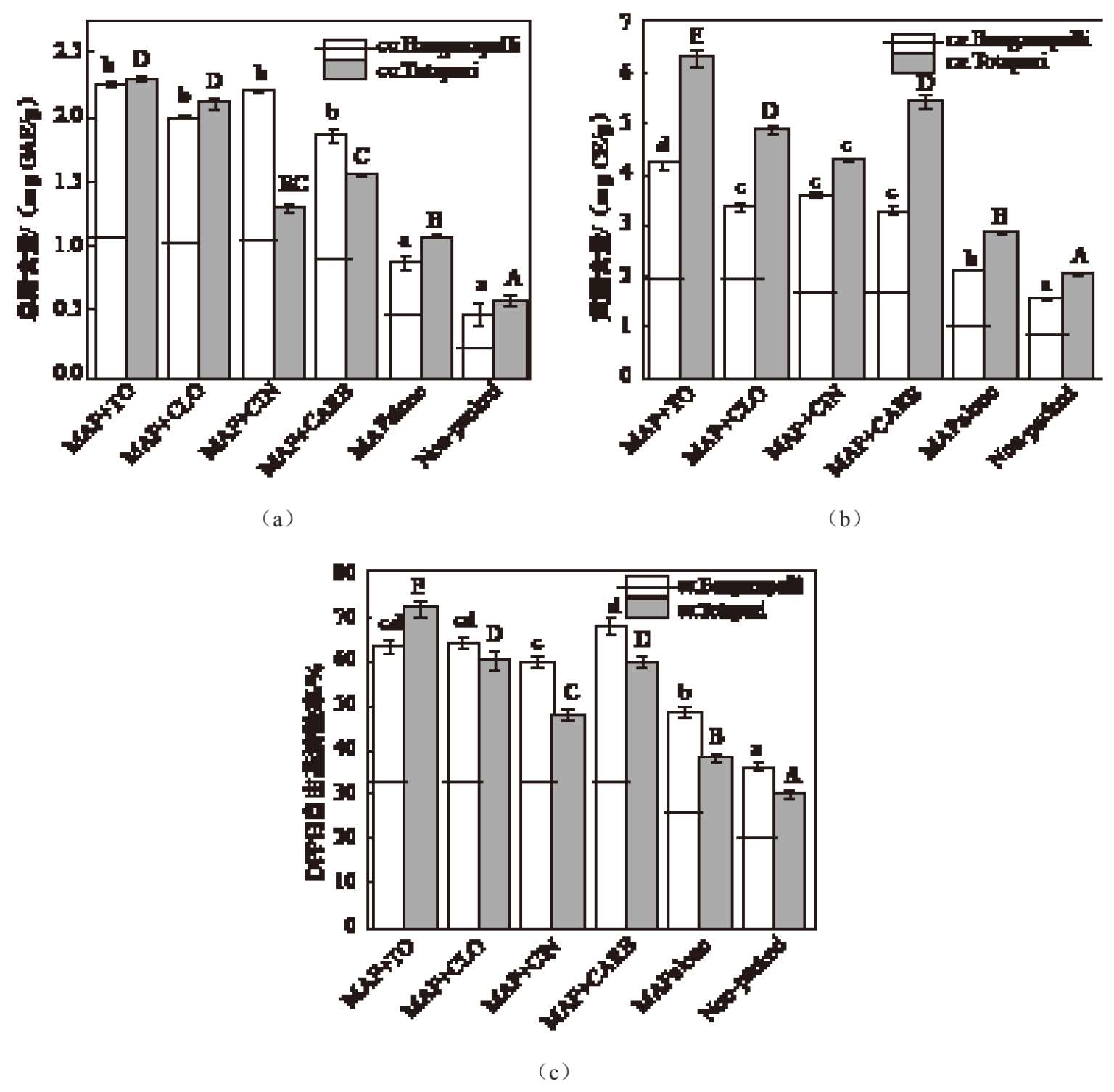 从图4-7可以看出,MAP+TO组杧果的总酚含量和黄酮含量均显著高于MAP+CARB组、MAP alone组和未包装组,不同品种间总酚含量变化幅度基本一致,但cv.Totapuri种杧果的黄酮含量高于cv.Banganapalli种杧果。MAP+TO组杧果的总酚含量和黄酮含量越高,表明MAP+TO处理越有助于保留杧果总的活性物质。MAP+TO组杧果的DPPH自由基清除率显著高于其他组,这可能是由于杧果的抗氧化活性很大程度上来自于自身的酚类化合物,精油成分也增强了杧果的抗氧化能力,也提高了果实组织对病原菌的抵抗力 [17] 。