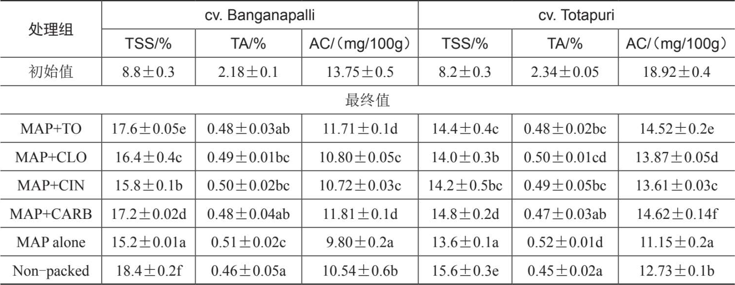表4-3 贮藏期间各处理组杧果(cv.Banganapalli和cv.Totapuri)的理化参数 [4]