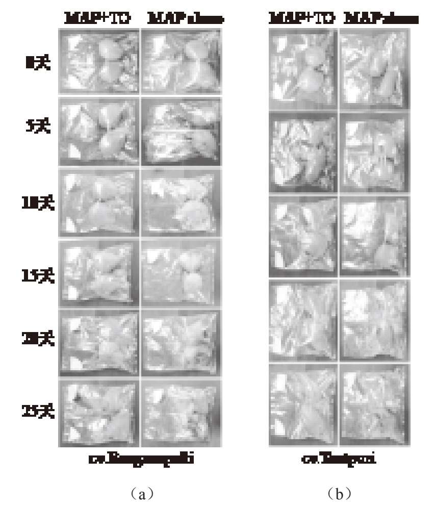 图4-1 贮藏期间MAP+TO组和MAP alone组杧果(cv.Banganapalli和cv.Totapuri)的照片 [4] (后附彩图)
