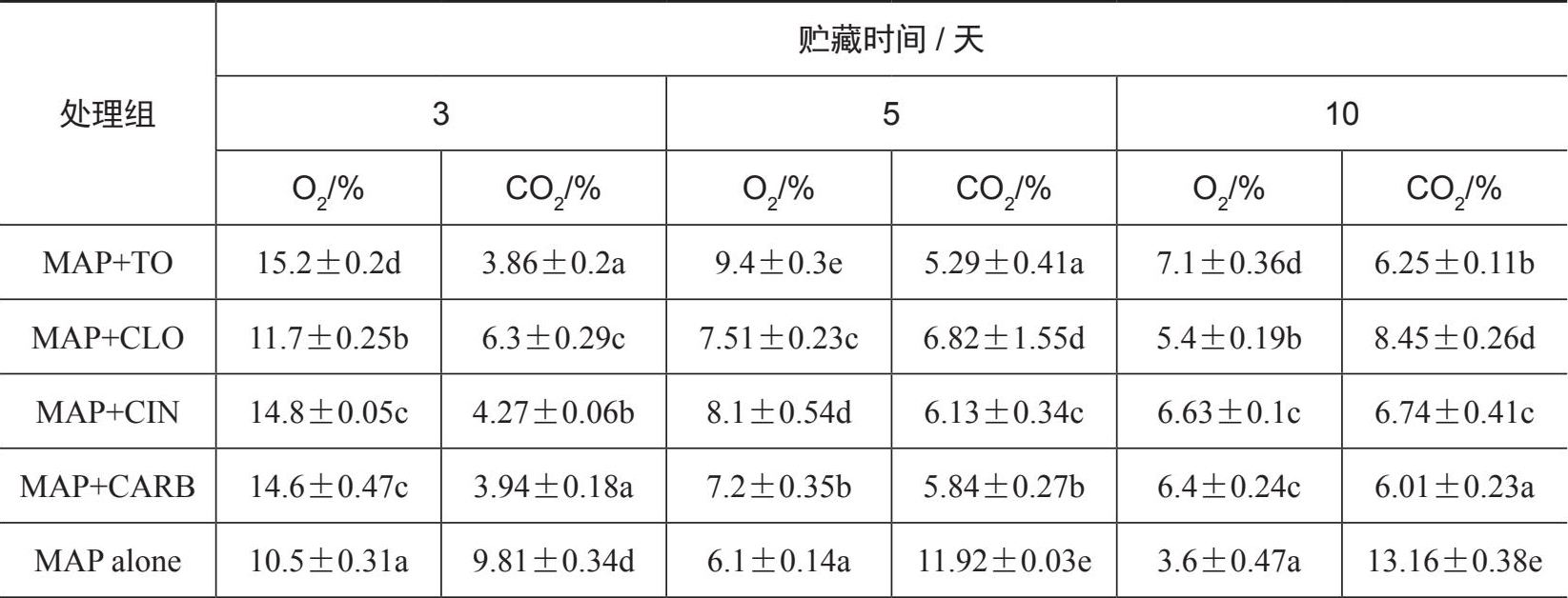 第3组是只使用MAP技术,MAP初始气体浓度为5%CO 2 +10%O 2 ,不含EOs和多菌灵,记为MAP alone组。