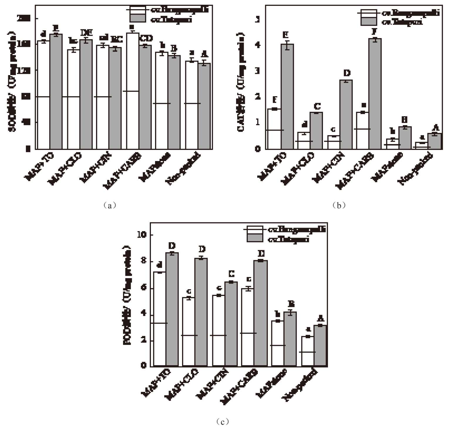 从图4-8可以看出,MAP+TO组杧果抗氧化酶的活性最高,未处理组杧果抗氧化酶的活性最低。EOs处理操作均显著提高了杧果的抗氧化酶活性。MAP+CARB组杧果(cv.Banganapalli)的SOD活性最高,MAP+TO组杧果(cv.Totapuri)的SOD活性最高。作者前期研究表明,使用浓度为66.7μL/L的气相TO处理后,杧果(cv.Banganapalli和cv.Totapuri)中的POD、SOD、CAT等抗氧化酶活性显著增强,有助于保持果实中酚类物质的含量。
