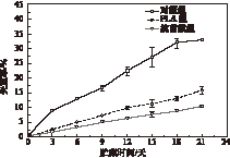 从图4-16可以看出,随着贮藏时间的延长,各处理组杧果的维生素C含量均呈现先增加后降低的趋势。这可能是由于呼吸作用和酶的作用导致杧果的成熟,进而加速了维生素C的生成。之后维生素C含量的减少是由于在呼吸过程中维生素C被消耗。对照组和PLA组杧果的维生素C含量分别在第6天和第9天达到峰值,第21天降到最低。抗菌膜组杧果的维生素C含量变化缓慢,第21天比PLA组高了182.30%,比对照组高了520.74%。因此,抗菌膜对维持杧果维生素C含量有显著的作用,因为抗菌膜释放的ClO 2 抑制了呼吸和乙烯的生成,从而降低了维生素C的氧化。
