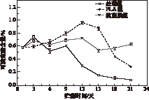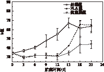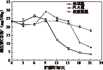 从图4-12可以看出,随着贮藏时间的延长,对照组杧果b值升高,果肉颜色逐渐变黄,在第15天达到最大值,数据表明杧果已经完全成熟了。第12天前,PLA组和抗菌膜组杧果的b值变化不大。第12天后,b值迅速增加。第21天,抗菌膜组杧果的b值比对照组和PLA组低了31.25%,表明抗菌膜有效延缓了杧果变黄的时间。这可能是由于PLA薄膜在杧果表面产生了低氧条件,抑制了叶绿素的氧化分解。ClO 2 的抗菌性抑制了叶绿素酶的活性,使得抗菌膜组杧果的b值变化较小。