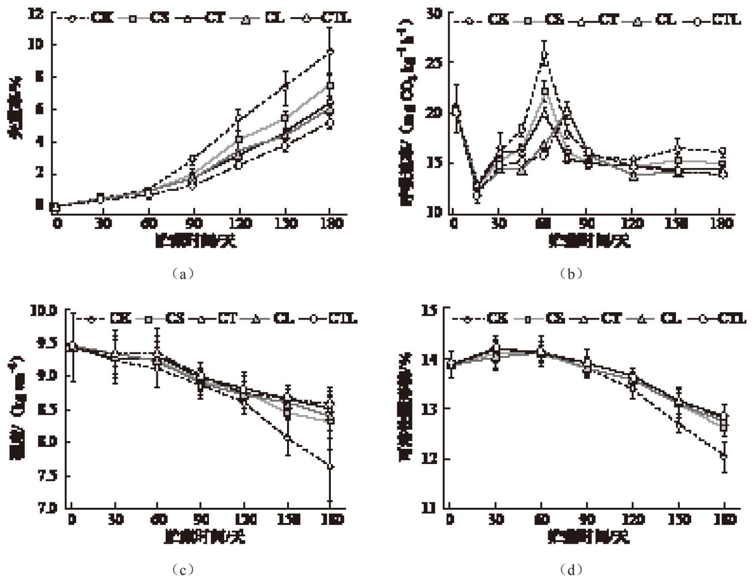 从图2-12(a)可以看出,涂膜处理的四组苹果的失重率明显低于对照组苹果,CTL处理是最有效的抑制失重的方法。从图2-12(b)可以看出,对照组的苹果的呼吸峰值大概出现在第50天,而CL组和CTL组苹果的呼吸峰值大概出现在第60天。结果表明,CL和CTL处理具有更强的抑制苹果采后呼吸的作用,这是由于CT、CL和CTL膜具有更致密的结构和更强的气体阻隔性。果实采后变软的主要原因是蒸腾作用、呼吸作用和细胞壁的水解 [46] 。从图2-12(c)可以看出,整个贮藏期内,各组苹果的硬度均出现持续下降,但是,涂膜处理明显地抑制了苹果硬度的下降。添加nano-TiO 2 或LPE有助于保持苹果的硬度。从图2-12(d)可以看出,在贮藏初始阶段,各组苹果的可溶性固形物含量均出现上升趋势,这是由于淀粉分解产生了大量的可溶性糖的缘故 [47] 。60天后,苹果缺少有机物质的供应,自身的可溶固体将作为呼吸底物被逐渐消耗,导致苹果可溶性固形物含量下降。180天时各涂膜处理组苹果的可溶性固形物含量明显高于对照组苹果。